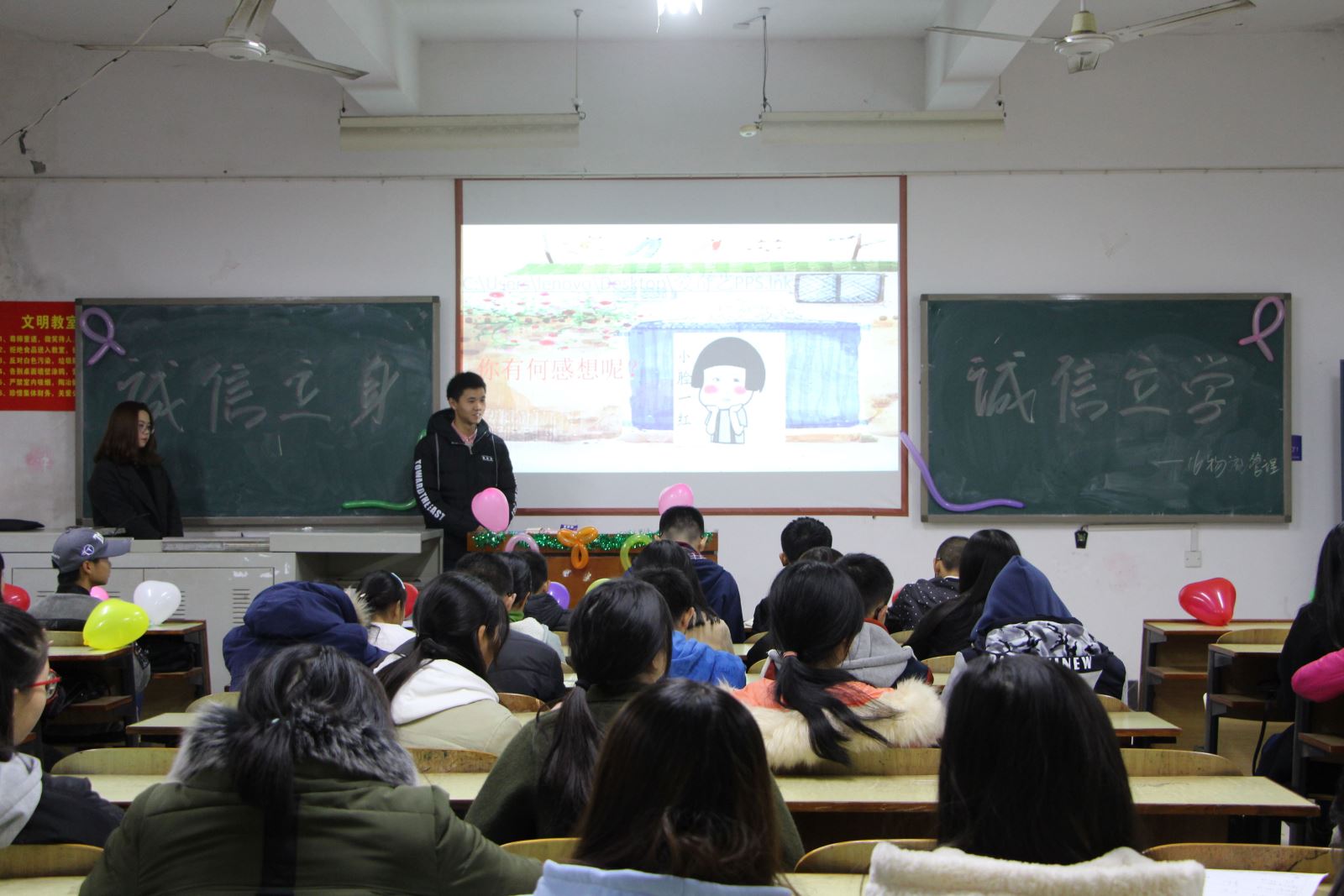 阳光正好,谈球吧体育官网入口公司管理公司各专业班级于2017年11月28日晚上7点举办了主题为“诚信立身,诚信立学”的班会,班会主要由班委负责,全体同学参加。