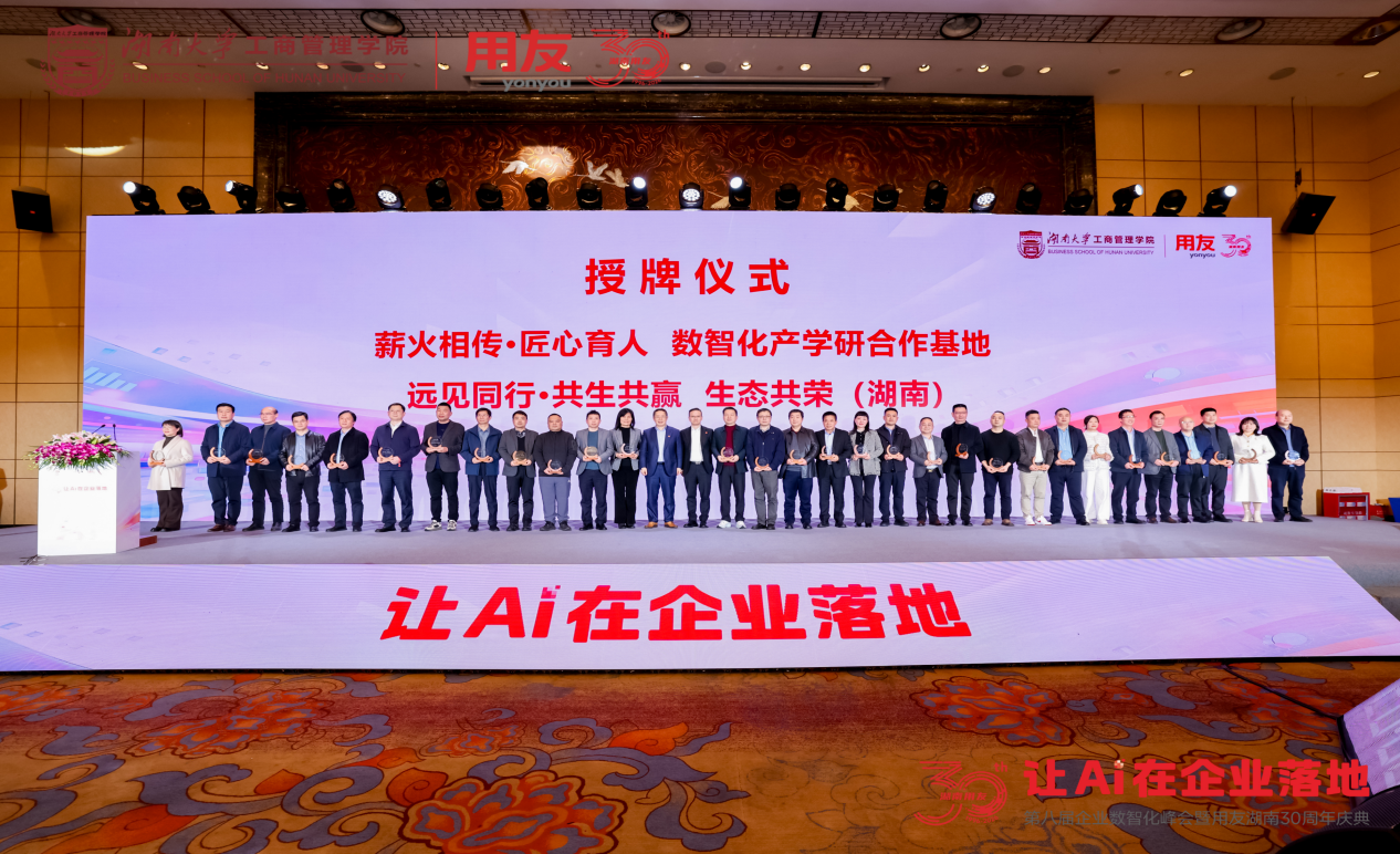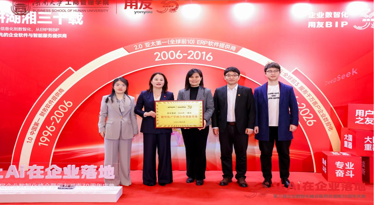 3月26日,湖南用友成立30周年庆典暨数智化产学研合作创新基地启动大会在长沙召开。谈球吧成功入选“2026年(湖南)数智化产学研合作创新基地”,谈球吧副经理谭赛代表公司上台接受授牌。
