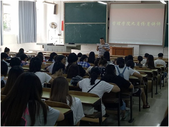 9月25中午12:20,管理公司工管、会计、旅管、物流、人力、市营全体单学号同学,在主校区教室内进行本学期第一次月评会议。学办辅导老师罗荃、黎博、单艳艳、包海燕、周艺、宋志航对工商管理、旅游管理、人力资源管理、会计学、物流管理六个进行讲评,本月心理会议也同月评会同一时间顺利展开。