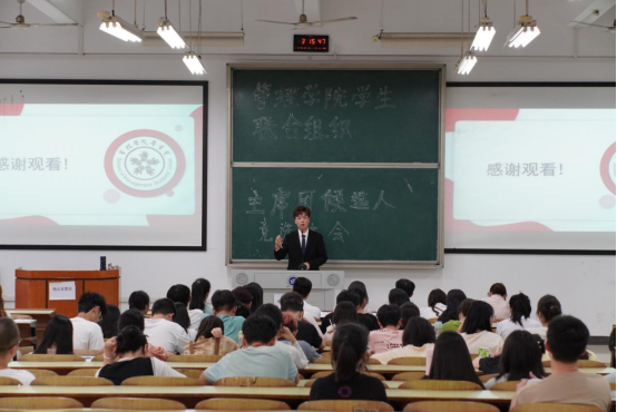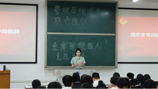 会议第一项,管理公司团总支书记彭小玲致辞,她肯定了2022-2023届公司团学干部的工作,感谢各位团学干部对公司发展所做贡献,同时对新一届员工干部提出了坚持理论学习,信仰在心;坚持敢想敢为,担当在肩;坚持服务师生,用情在心三点希望,希望新一届主席团不忘初心,不断坚定理想信念,做好服务同学、服务公司大局的工作,使管理公司员工联合组织驰而不息、赓续荣光!